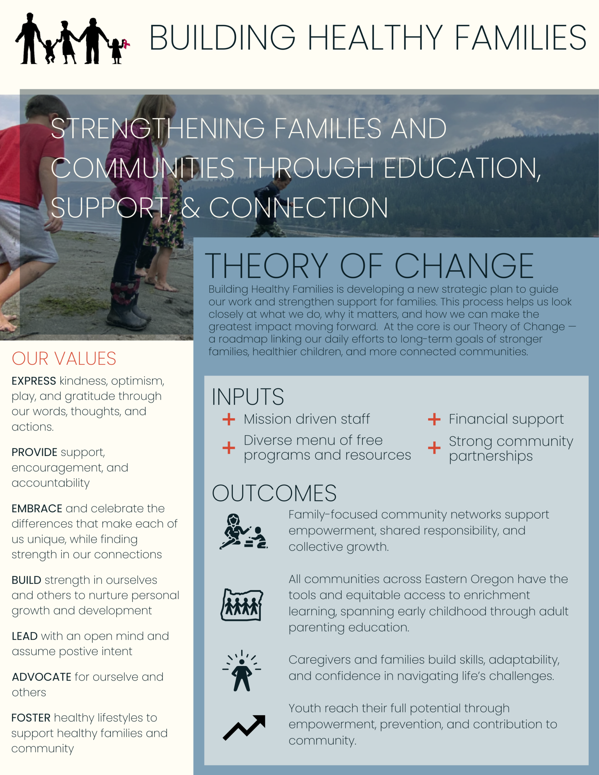 This plan is meant to grow with us. Each year, we set clear actions to move our priorities forward and adapt as circumstances, needs, and opportunities change. What stays constant is our commitment to supporting families and building healthy communities across Eastern Oregon.